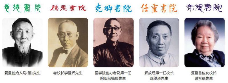 復(fù)旦大學(xué)目前有五個四年制住宿書院,分別以老校長的名或字命名。志德書院,紀(jì)念復(fù)旦創(chuàng)始人馬相伯(原名志德)先生,院服、院旗以綠色為標(biāo)志性顏色;騰飛書院,紀(jì)念老校長李登輝(字騰飛)先生,以紅色為標(biāo)志色;克卿書院,紀(jì)念上海醫(yī)學(xué)院創(chuàng)辦者顏福慶(字克卿)先生,以藍(lán)色為標(biāo)志色;任重書院,紀(jì)念解放后第一任校長陳望道(字任重)先生,以橙色為標(biāo)志色;希德書院,紀(jì)念復(fù)旦歷史上的首位女校長謝希德先生,以紫色為標(biāo)志色。